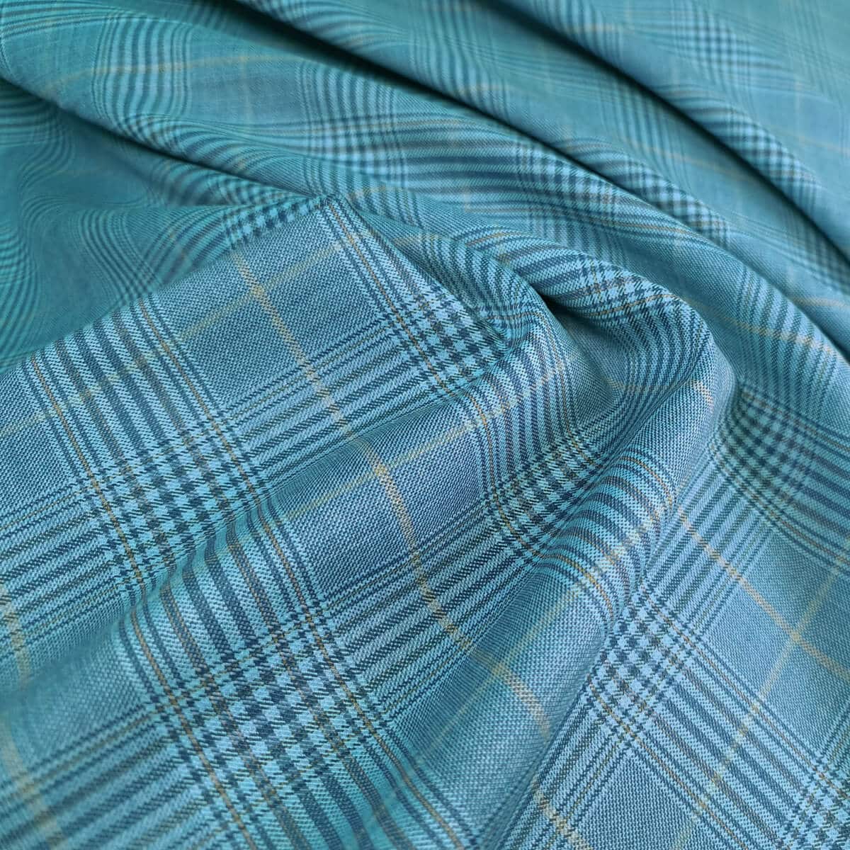 - Garniturowa wełna w kratę niebieska. Typ SUPER 130S, produkcja w renomowanej włoskiej fabryce Leadford & Logan. To naturalny, luksusowy materiał na garnitury i wiele innych kreacji. Doskonale izoluje wilgoć, jest komfortowy w noszeniu, oddychający oraz niegryzący. Dzięki zaawansowanemu procesowi produkcji tkanina jest mniej podatna na gniecenie — po krótkotrwałym zniekształceniu wraca do pierwotnej formy. Matowa, szlachetna powierzchnia nadaje gotowym ubraniom elegancki wygląd.